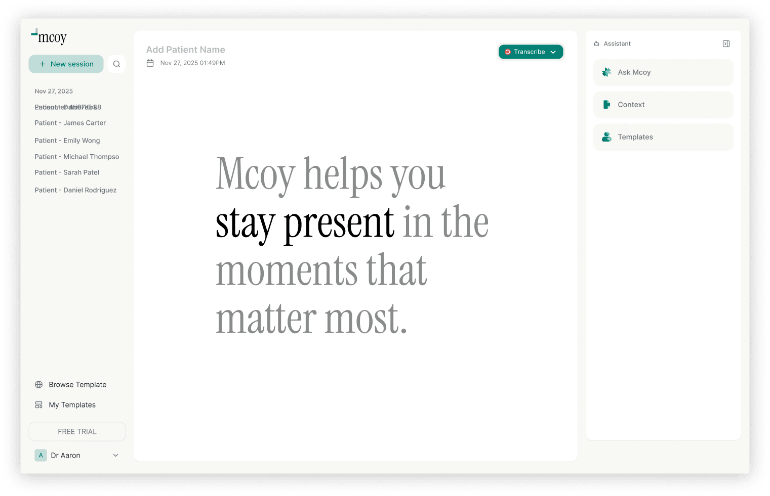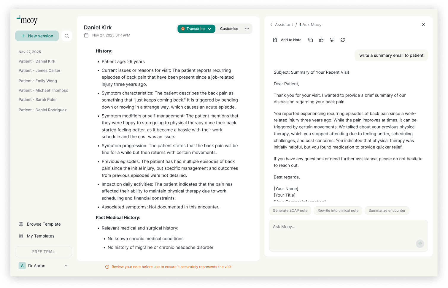 Mcoy keeps patient and visit context in mind so documentation stays relevant and consistent.